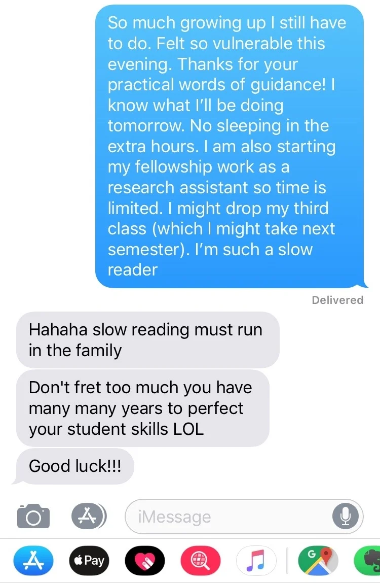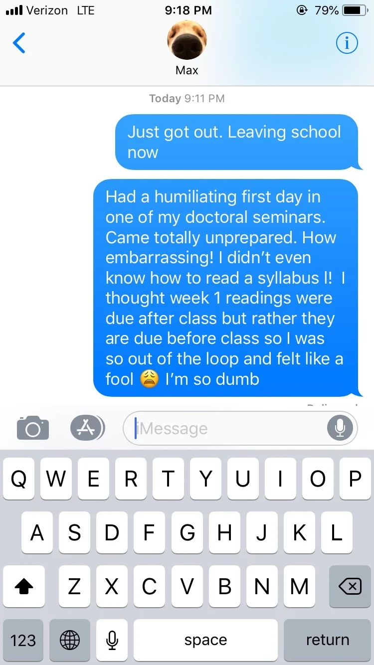 One week later, I can tell you that I hit an absolute low point in my self-esteem this week, doubting my sense of worth. Have you ever felt like you are an imposter, like you don’t belong? That’s how I felt on Tuesday, the first “official” day of one of my doctoral seminars in the program. Although I thought I had done everything right to prepare for this class, I left that evening (9pm) feeling distraught. Not only was participation graded, and I had only shared once (and only to be called on because I had my hand raised for a long time, but every aspect of the professor’s body language indicated that he/she was ready to move on; even the visual slides displayed had been taken down in anticipation for the next discussion), but also could I not coherently articulate what I had prepared in my mind while I was waiting for my turn to finally come. I had substantive points to make, but no opportunity to make them. Everything was just so fast-paced (a 300-page book condensed into a five minute share-out?). I usually don’t see myself as an anxious person, but that class gave me enough anxiety to last me days. Oh, and it did not help that I could not properly read a syllabus (has it really been that long?) and had only barely skimmed through the articles that I thought would be due AFTER week 1 (and hence, I was being a proactive student) that were actually due BEFORE class. Bravo, Catherine, bravo.