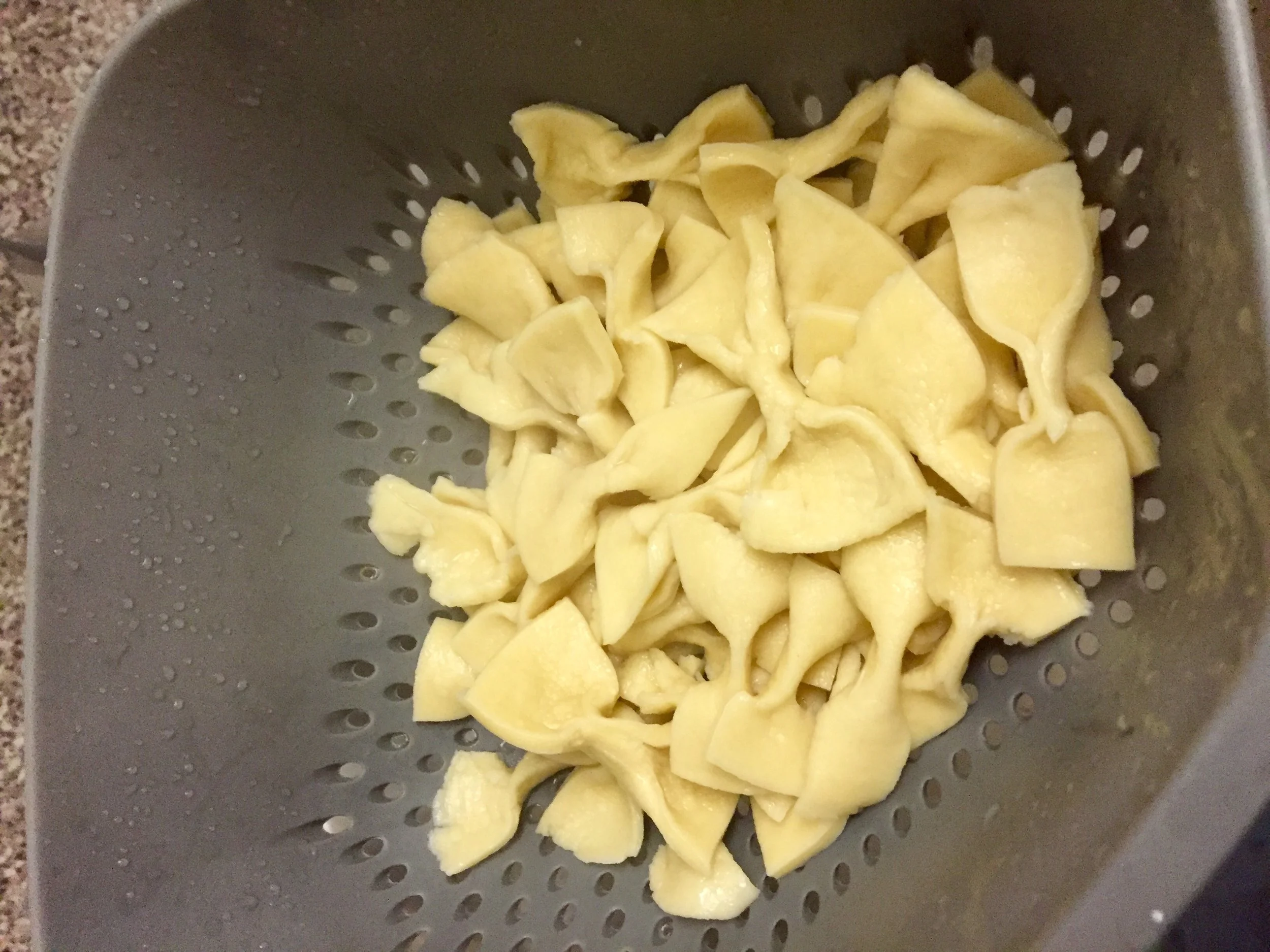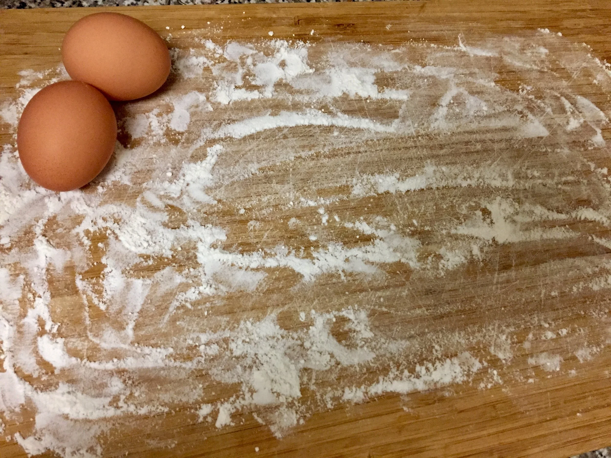 P.P.S. Should I own a rolling pin, this process would have been less labor-intensive. The dough would have also been less dry had I maintained the ratio of flour to egg of 2:1 by mass. I did not have a kitchen balance/scale so had to use my portable luggage scale.