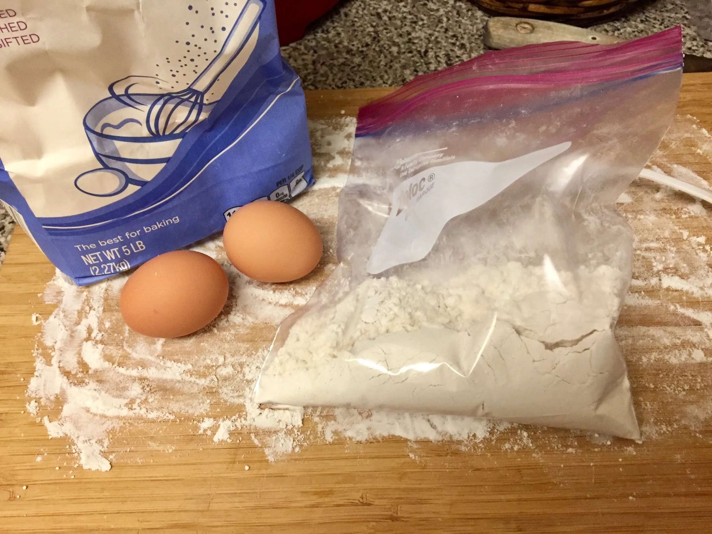Since I do not own a kitchen scale/balance, I used a Ziploc bag to hold the flour, punched a hole in the bag, and used the hook of my luggage scale to measure the weight of the flour. Since precision is not what I was aiming for, I did not zero out the weight of the bag itself. I aimed for about 90 grams of flour (double the mass of the eggs).