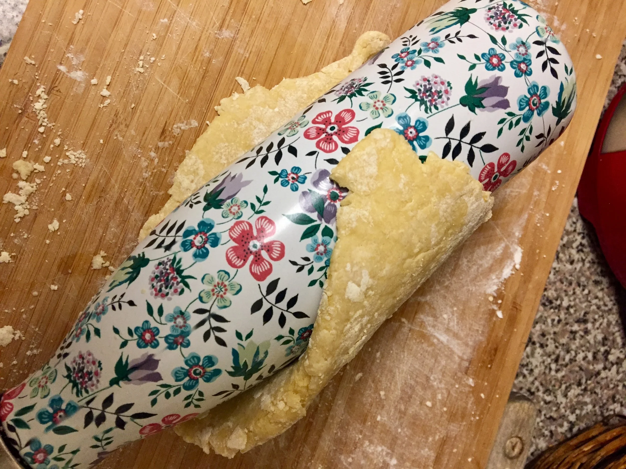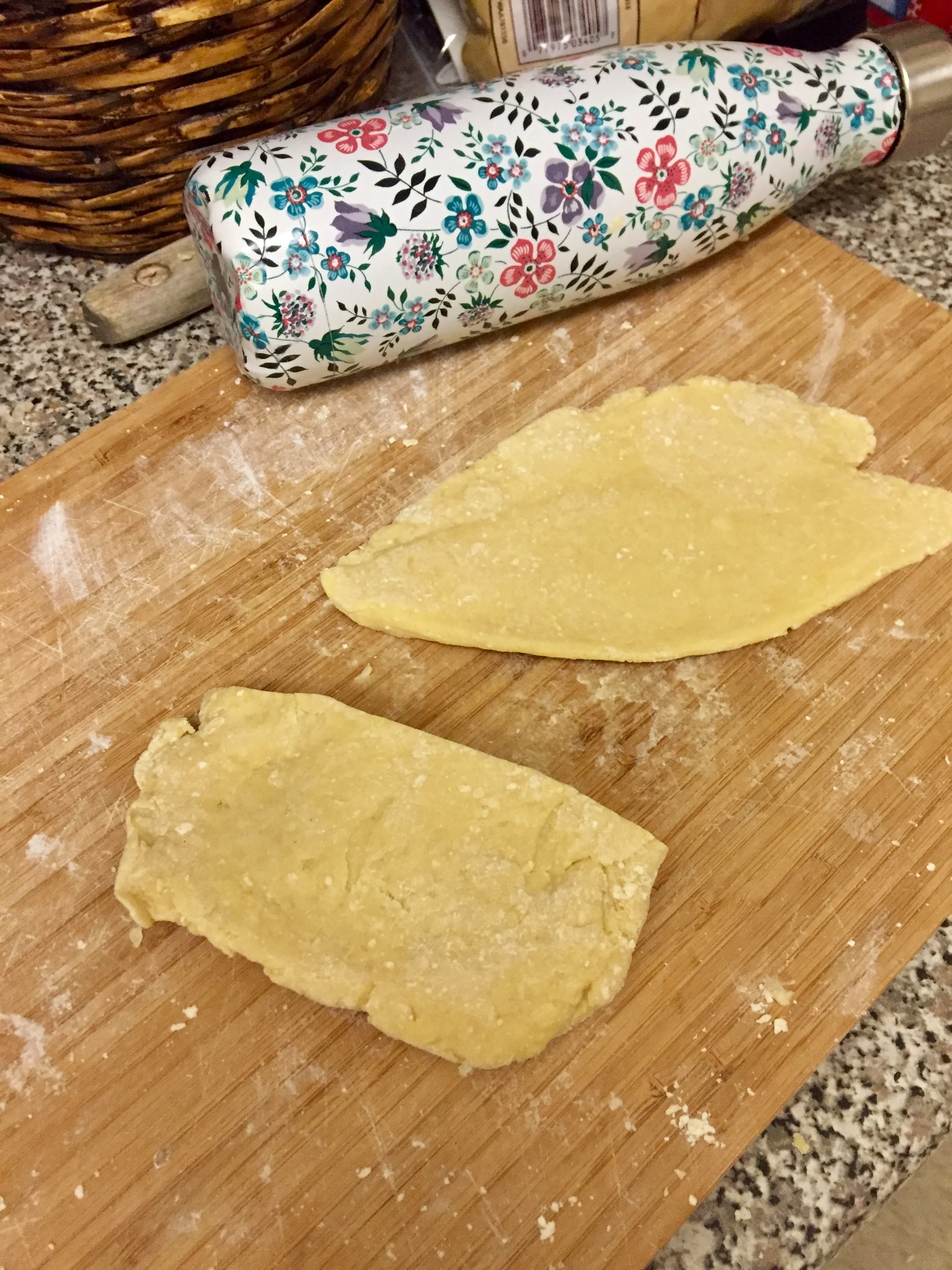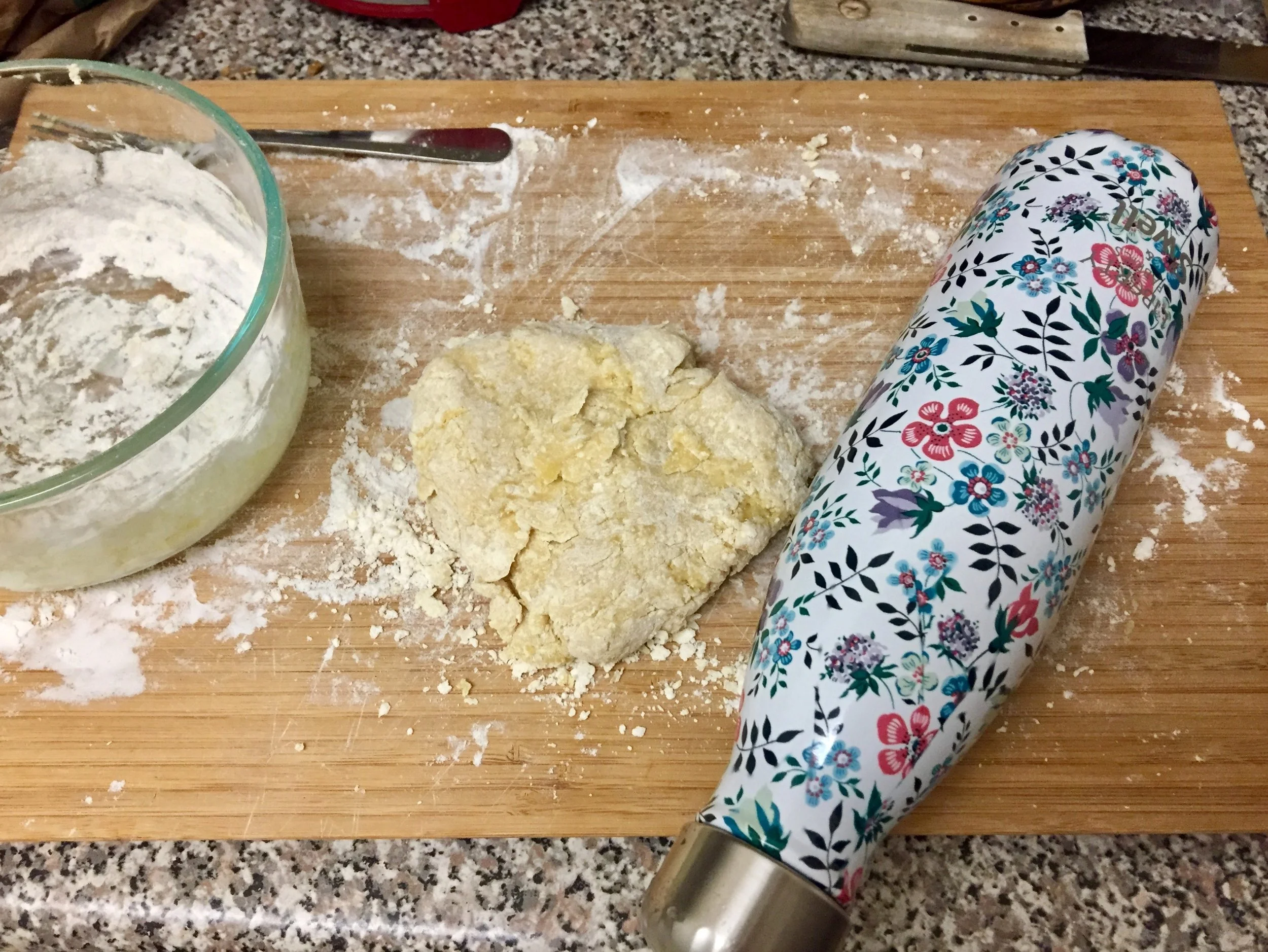 I also do not own a rolling pin, so I resorted to using my swell bottle to flatten the dough. This was a major challenge. I am told wine bottles are better than swell bottles. Note to self for next time, although by next time, I imagine I will have a proper rolling pin (the local grocers did not carry rolling pins).