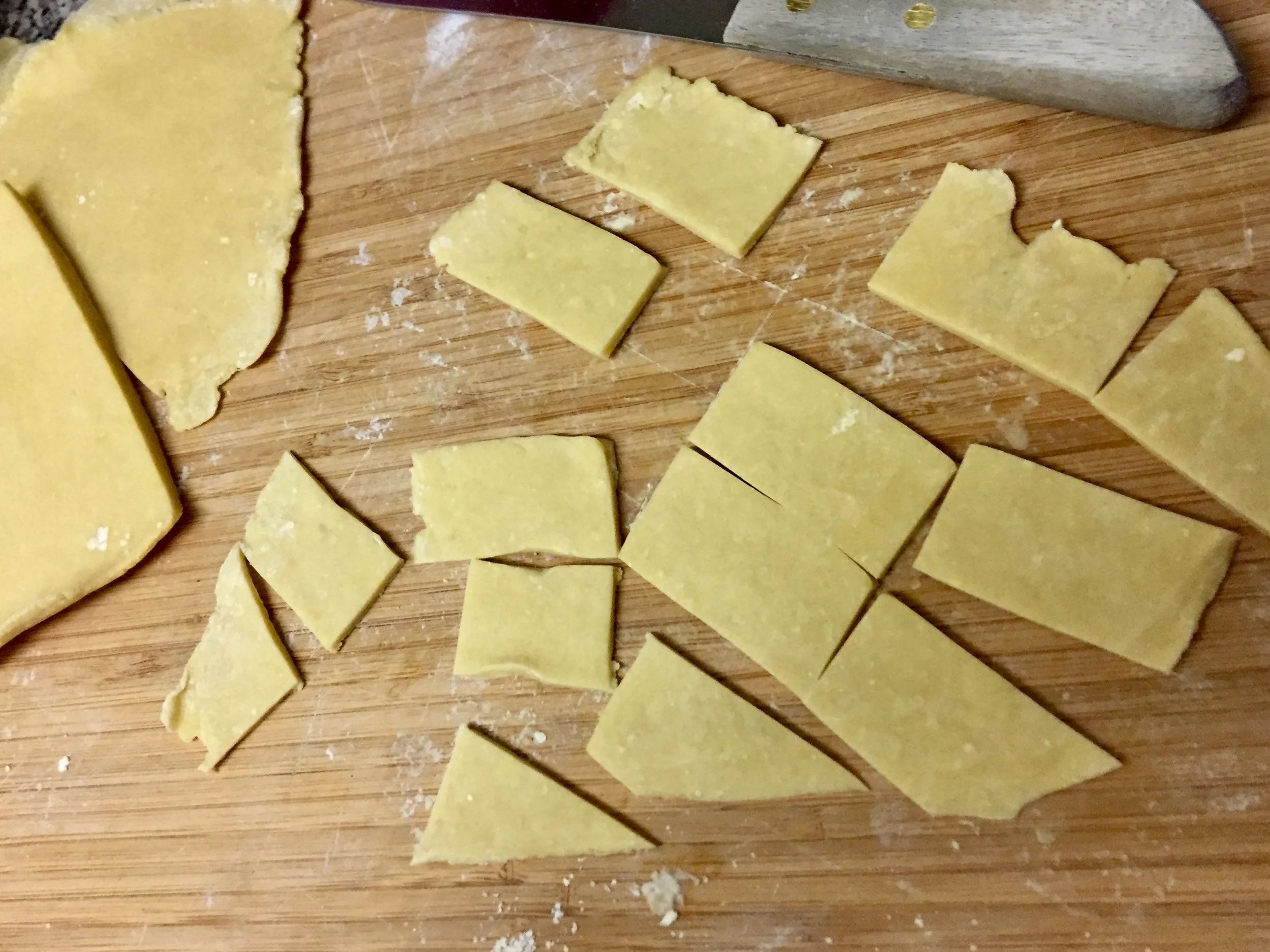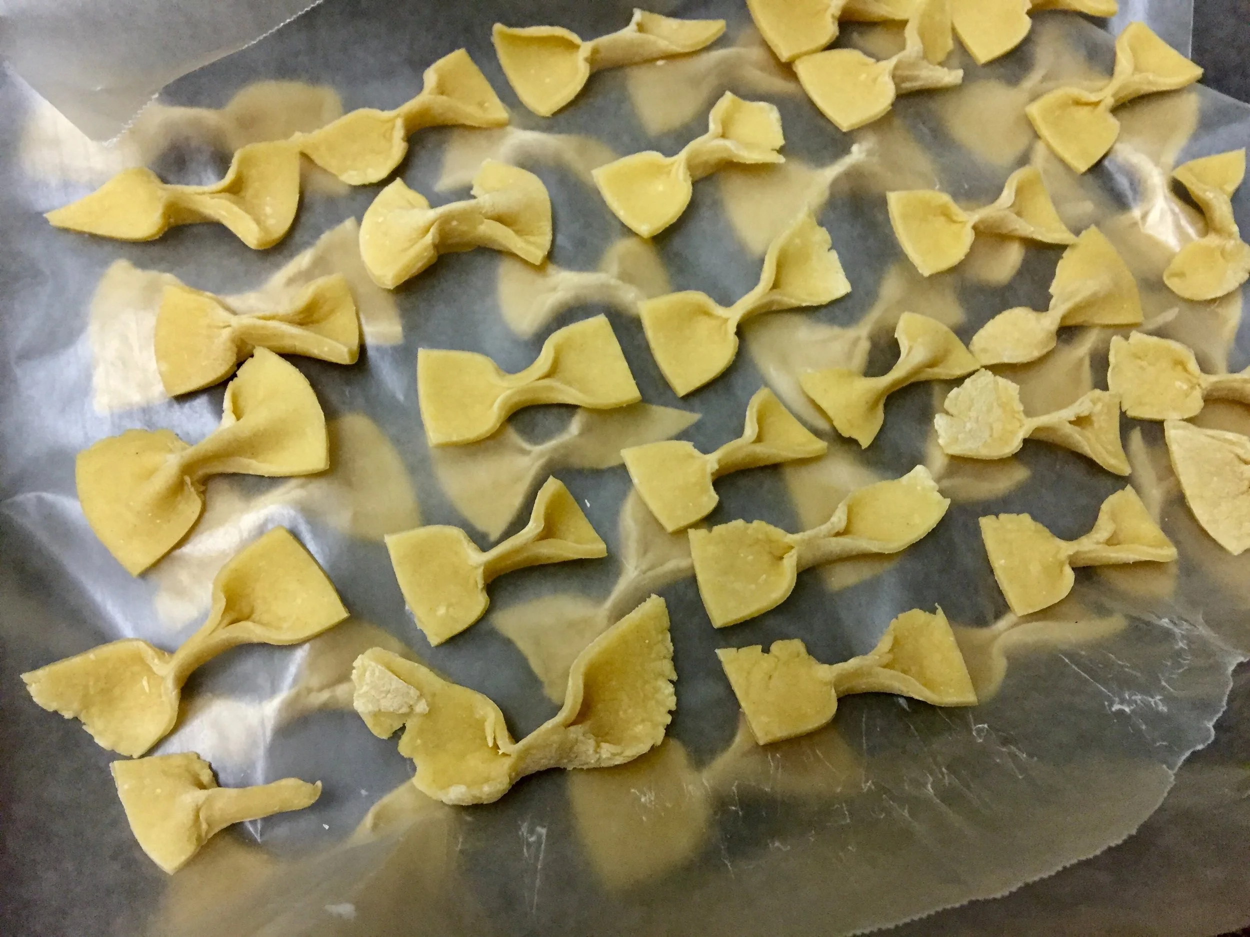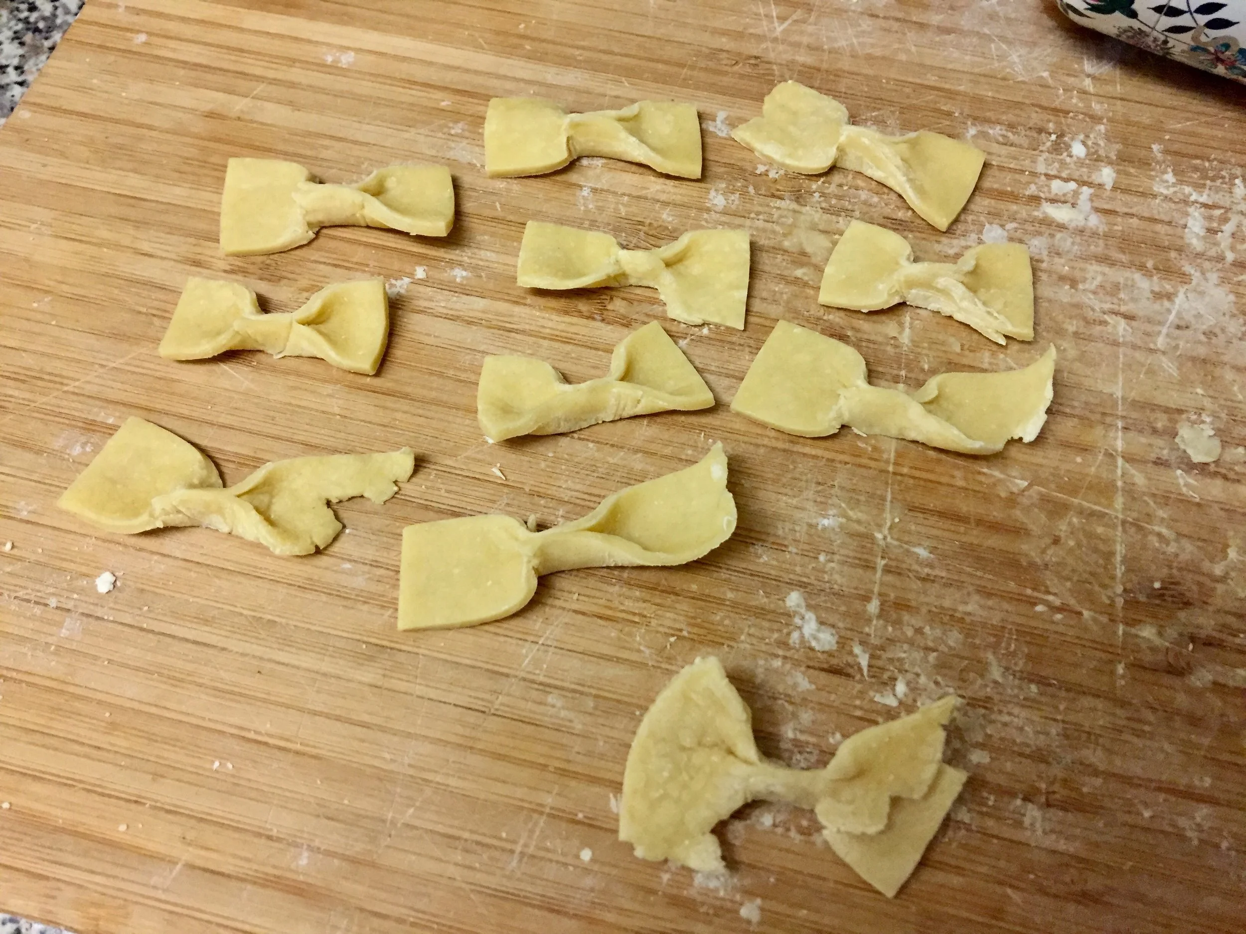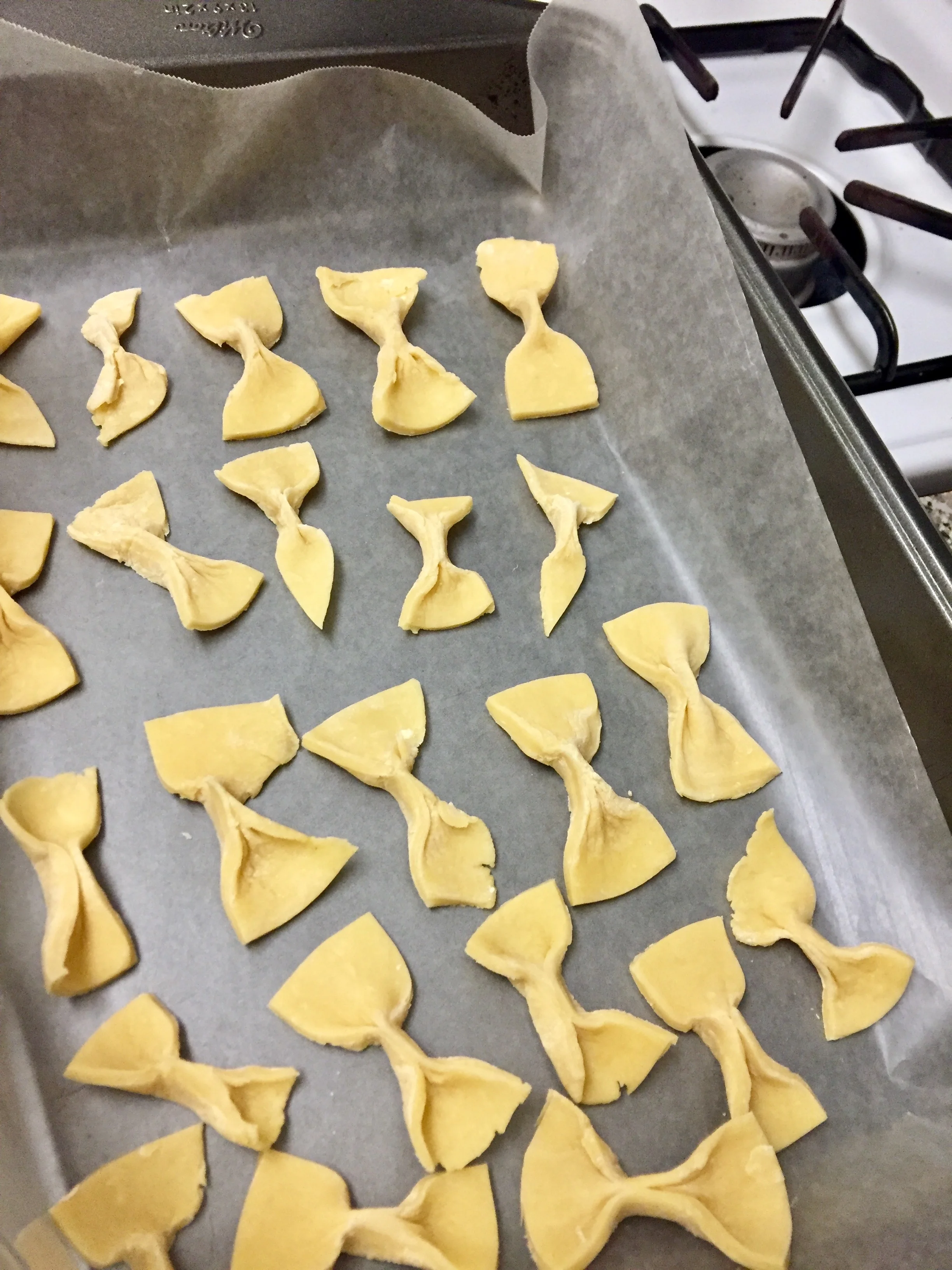 Rectangular dough becoming farfalle… Simply use your thumb and pointer finger to pinch together the middle of the dough to create little bows.