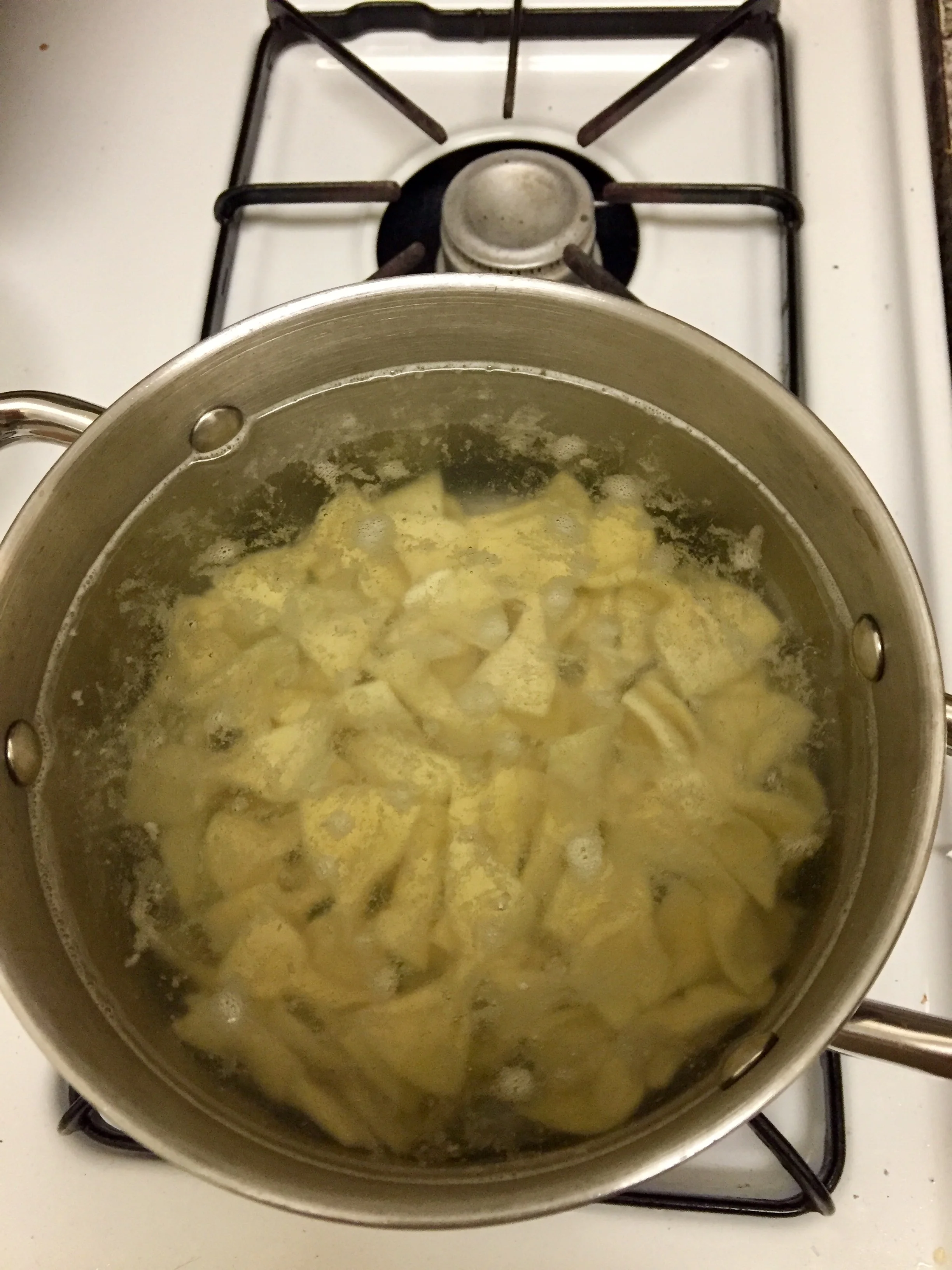 Because the dough was freshly made, there was no need to hydrate the pasta. As such, once the water boiled, it only took 2 minutes to achieve an al dente state. It would have taken less time had the pasta been thinner…