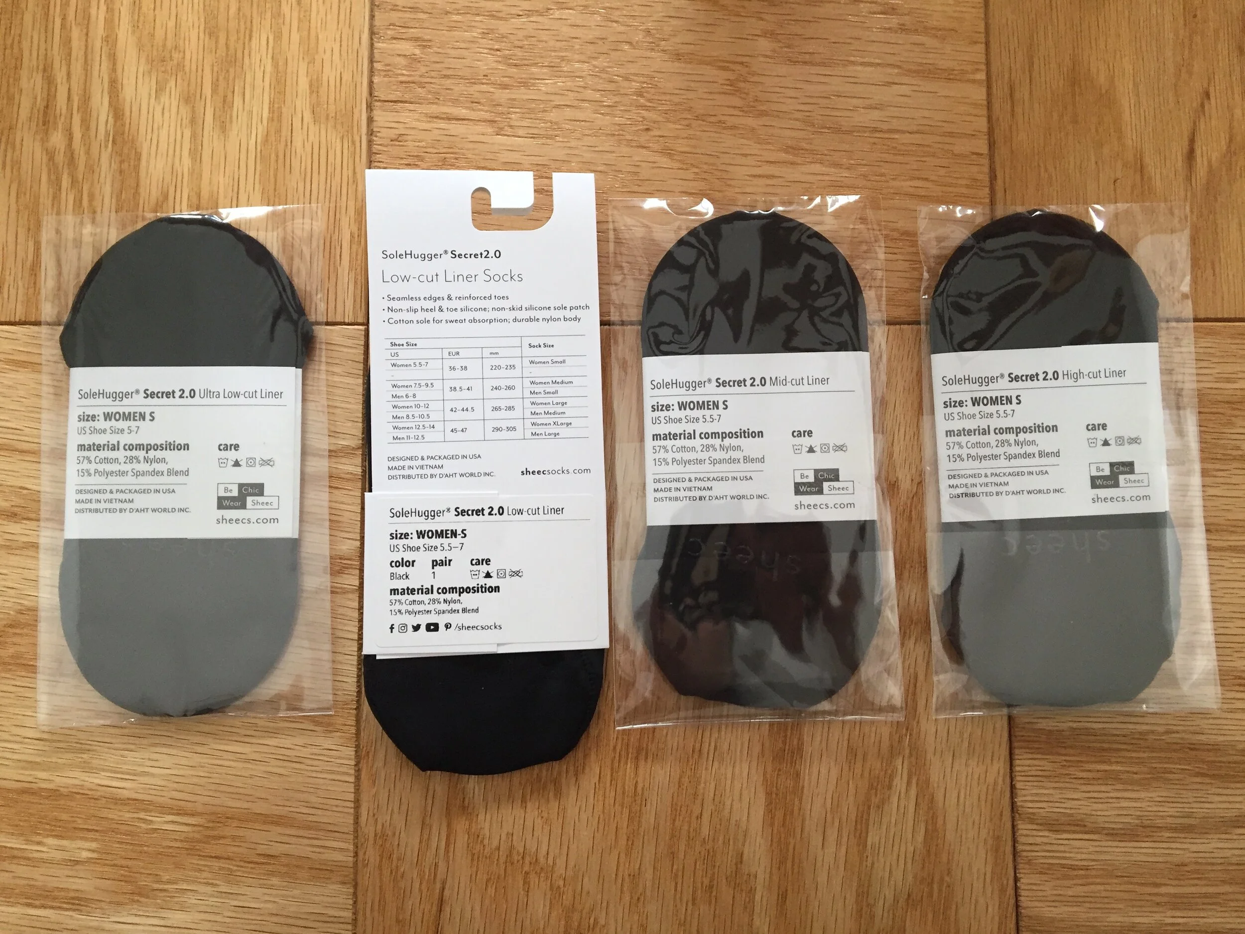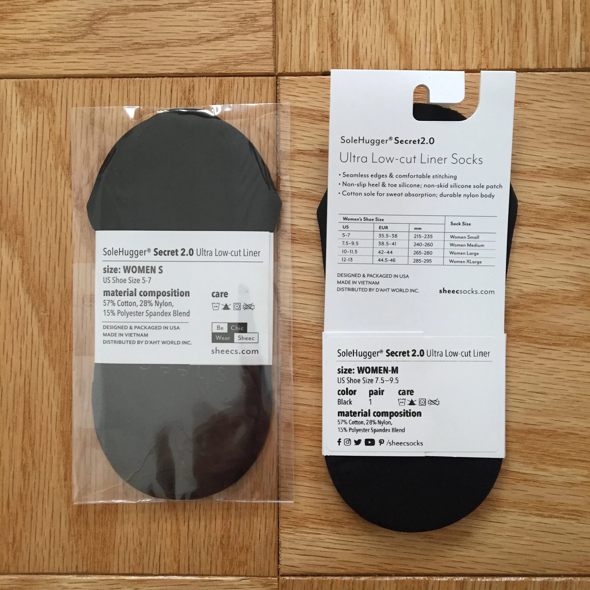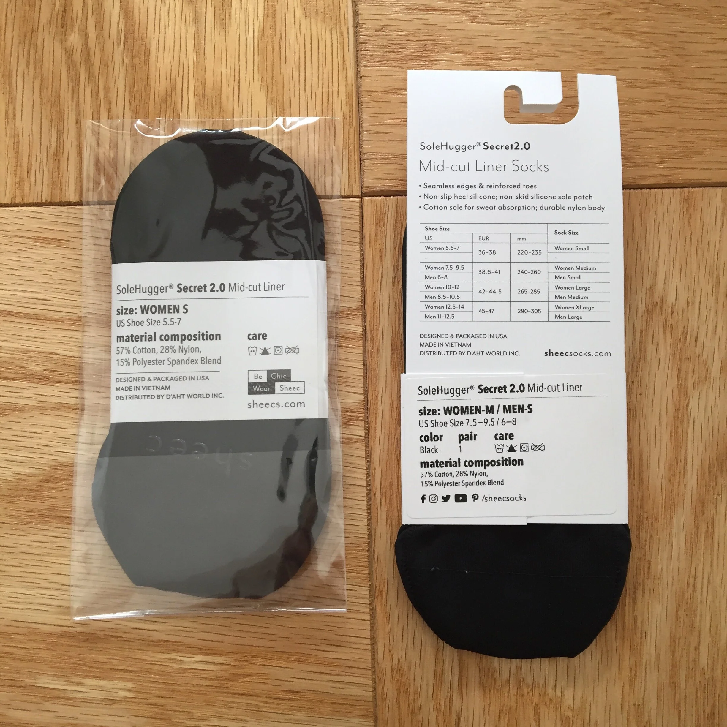 These are the same SoleHugger Secret 2.0 liner socks, except that I’m showing you the information on the packages, including the material composition, care instructions (more about this below), and size information. The packaging is different depending on where you purchase the socks—it is my understanding that the plastic packaging is if you purchase (in bulk) through Amazon instead of differently through the Sheec website.