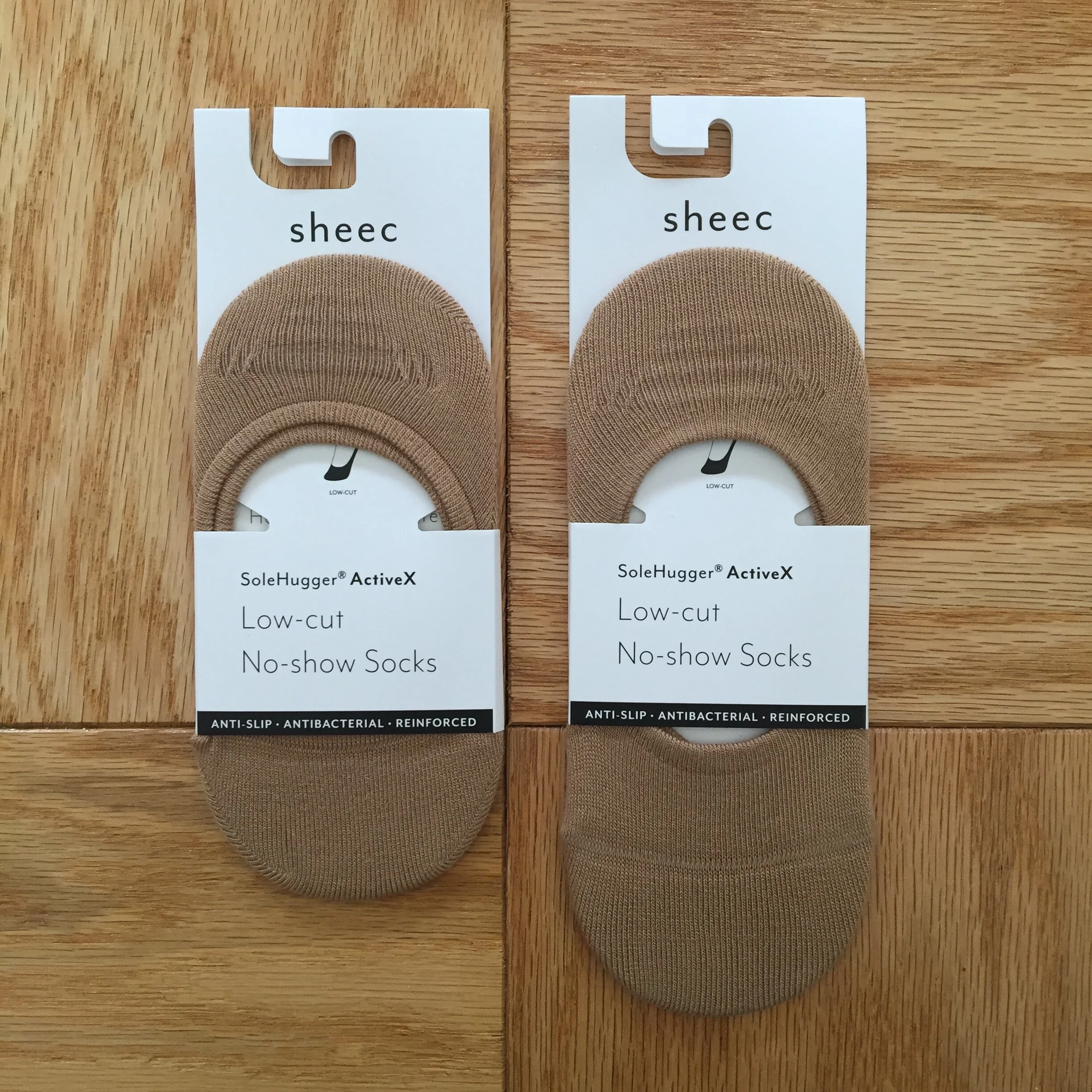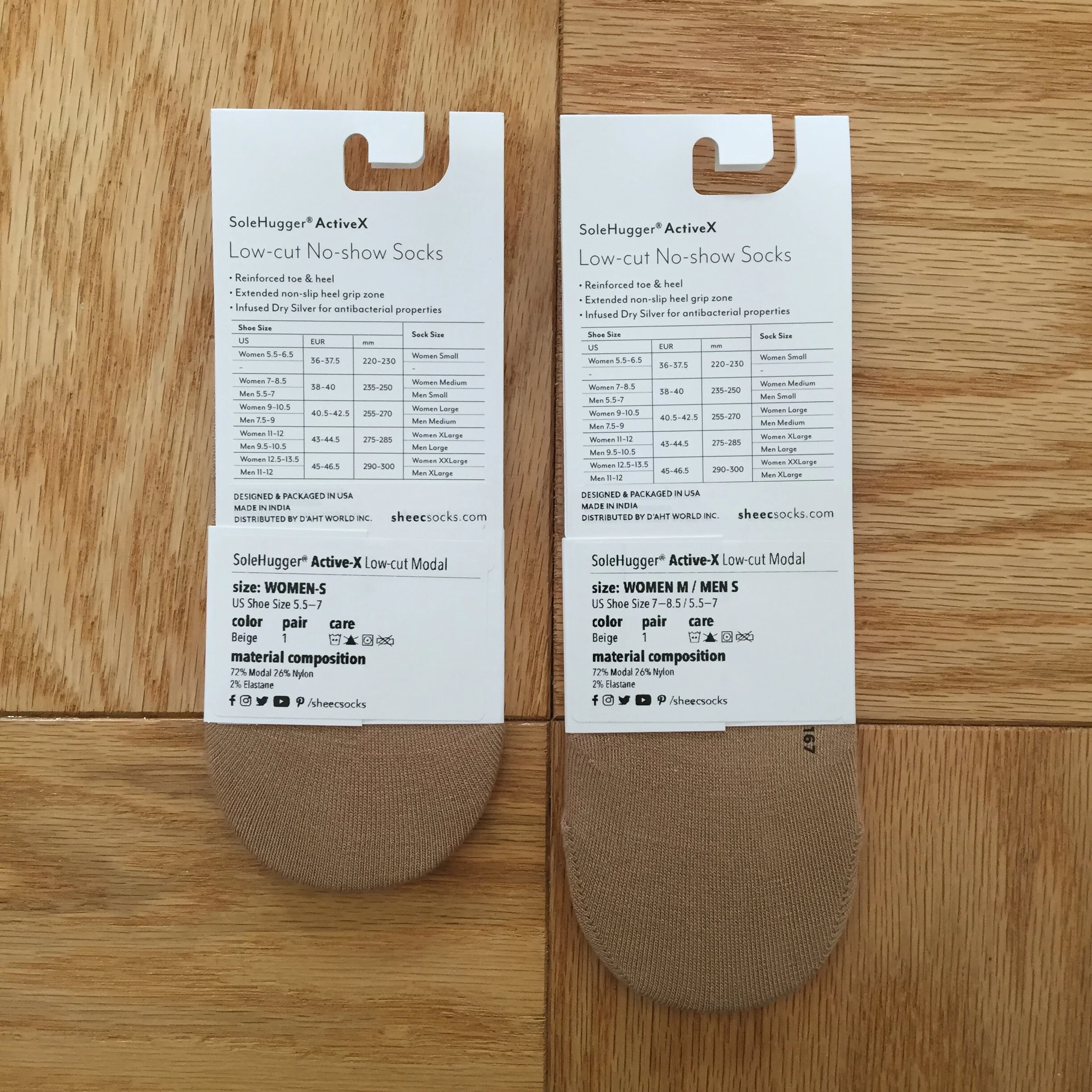 Finally, we have the line of SoleHugger ActiveX no-show socks. These are made of a thicker modal material and are meant for “casual shoes,” per the Sheec website (i.e., sneakers, loafers, boots, and other flat shoes). These come in 5 sizes (S-XXL) and are more “unisex”; you can see from the back of the packaging that the smallest size is for women only, but all other sizes are for both men and women. There are two colors available (black and beige); I only have photos of the beige color, but I recently bought myself the black color and love them!