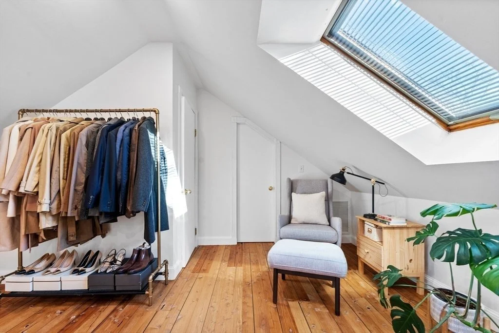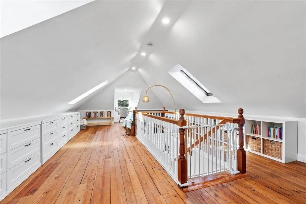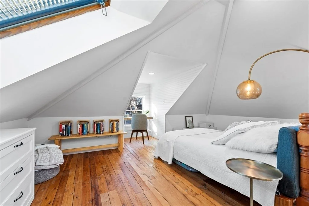 Here’s a peek of our finished attic (the second floor of our condo in Jamaica Plain of Boston), which I designed as a multifunctional space: as a master bedroom, office, reading nook, and extended storage space. This space looked nothing like this when we bought the place; in fact, it looked and felt neglected, which makes it even more fun to renovate and reimagine.