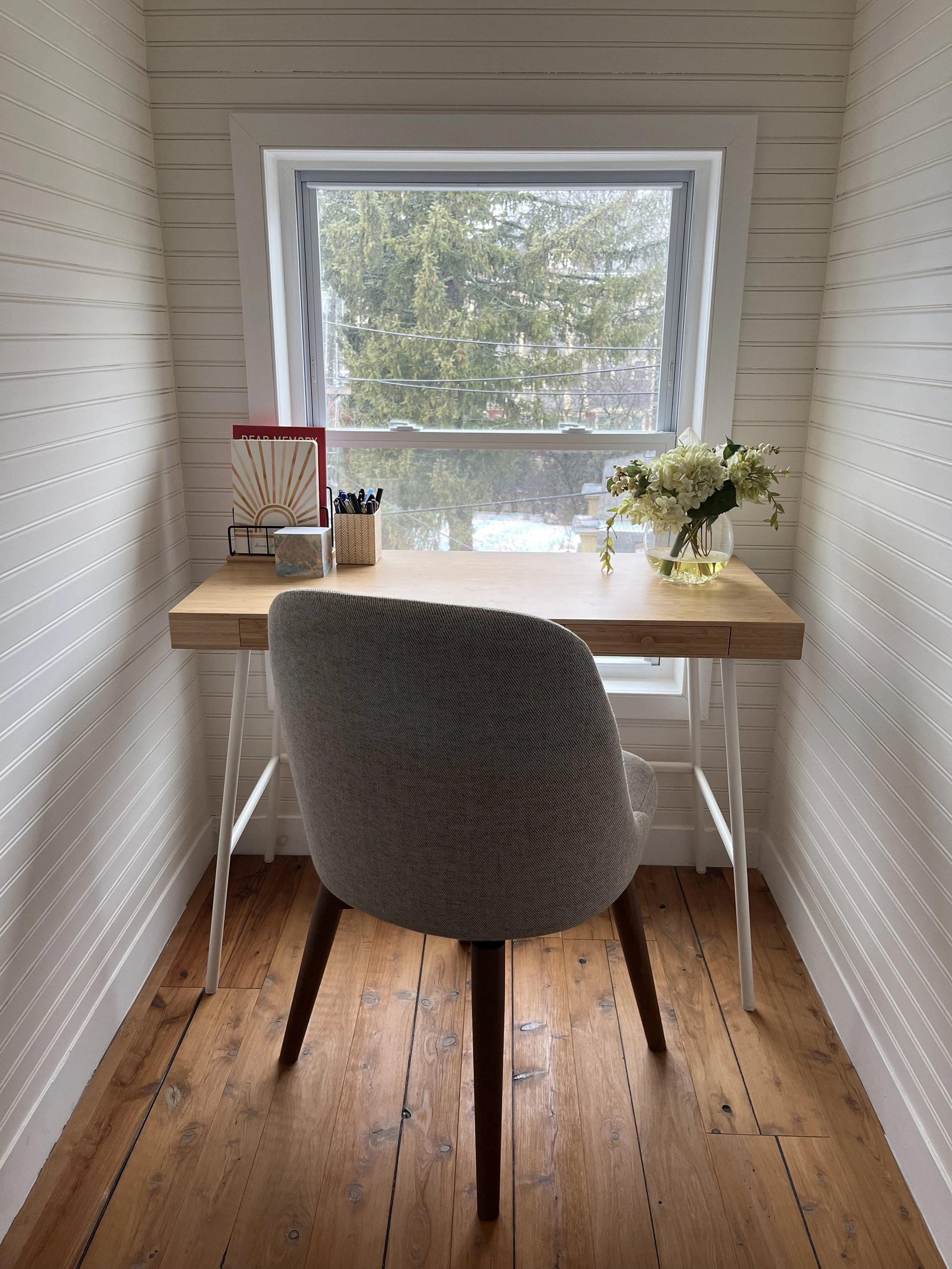 In designing the office area, I had to design around the existing features of the space (e.g., the low sloped ceilings, the small dormer) and to maximize both space and functionality of seeming limitations. These awkward nooks and angled spaced became the raw material for reimagining what became my office space post COVID, when I pursued a lot of remote work. Here you see a DIY horizontal bookshelf situation using IKEA products that I have had for nearly a decade, as well as a sunlit desk area framed with shiplap adding definition and intrigue.