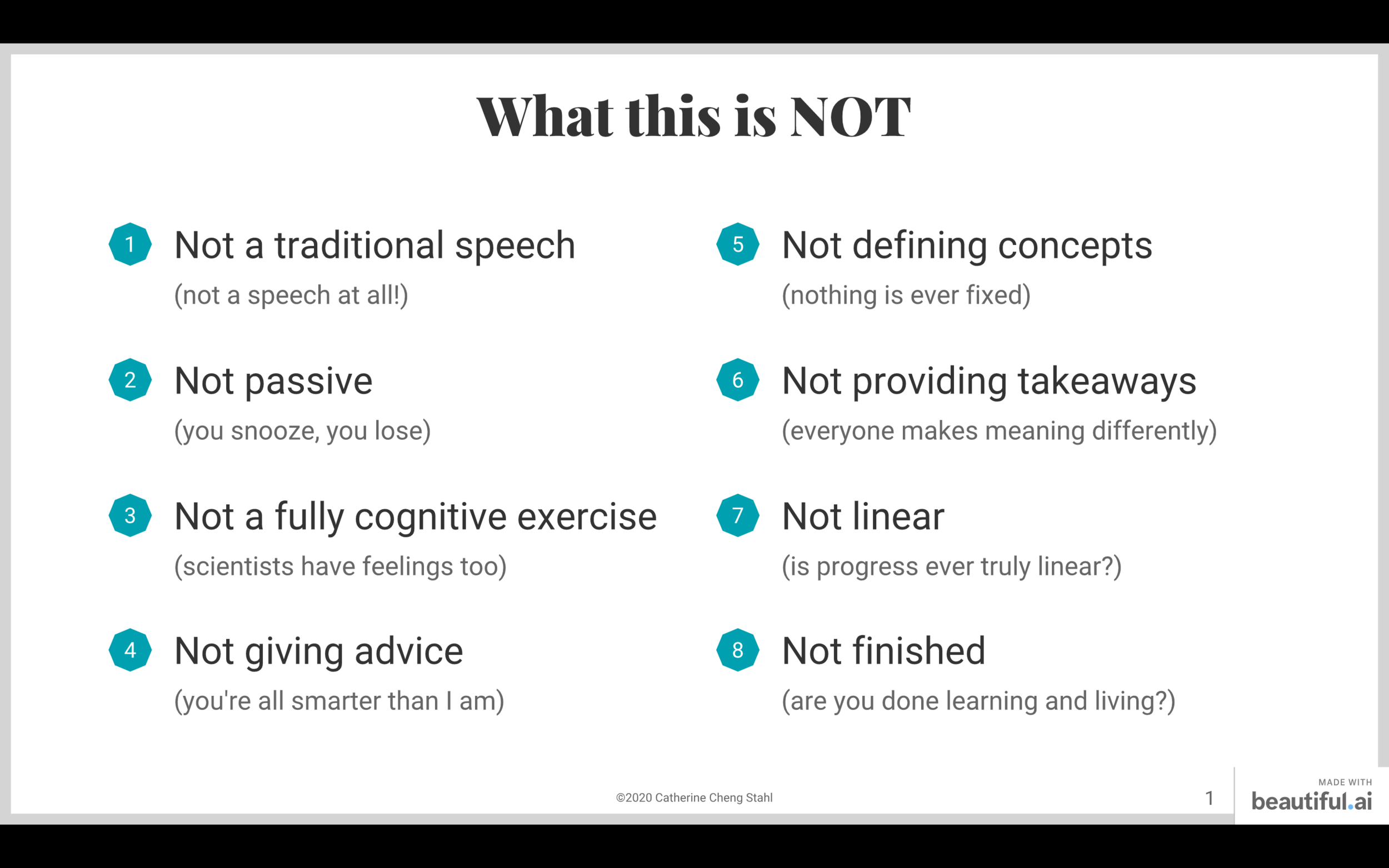 Imposter syndrome quickly enveloped me—a phenomenon that is perhaps all too familiar among students and academics alike who hope to “make it.” I took a few days to sit with the swirling feelings and to reflect—2 practices that have become part of the fabric of my everyday life during this time of social distancing. I hope that after this keynote, you, too, might sit with the ideas and reflect on any meanings that the words may have evoked for you.