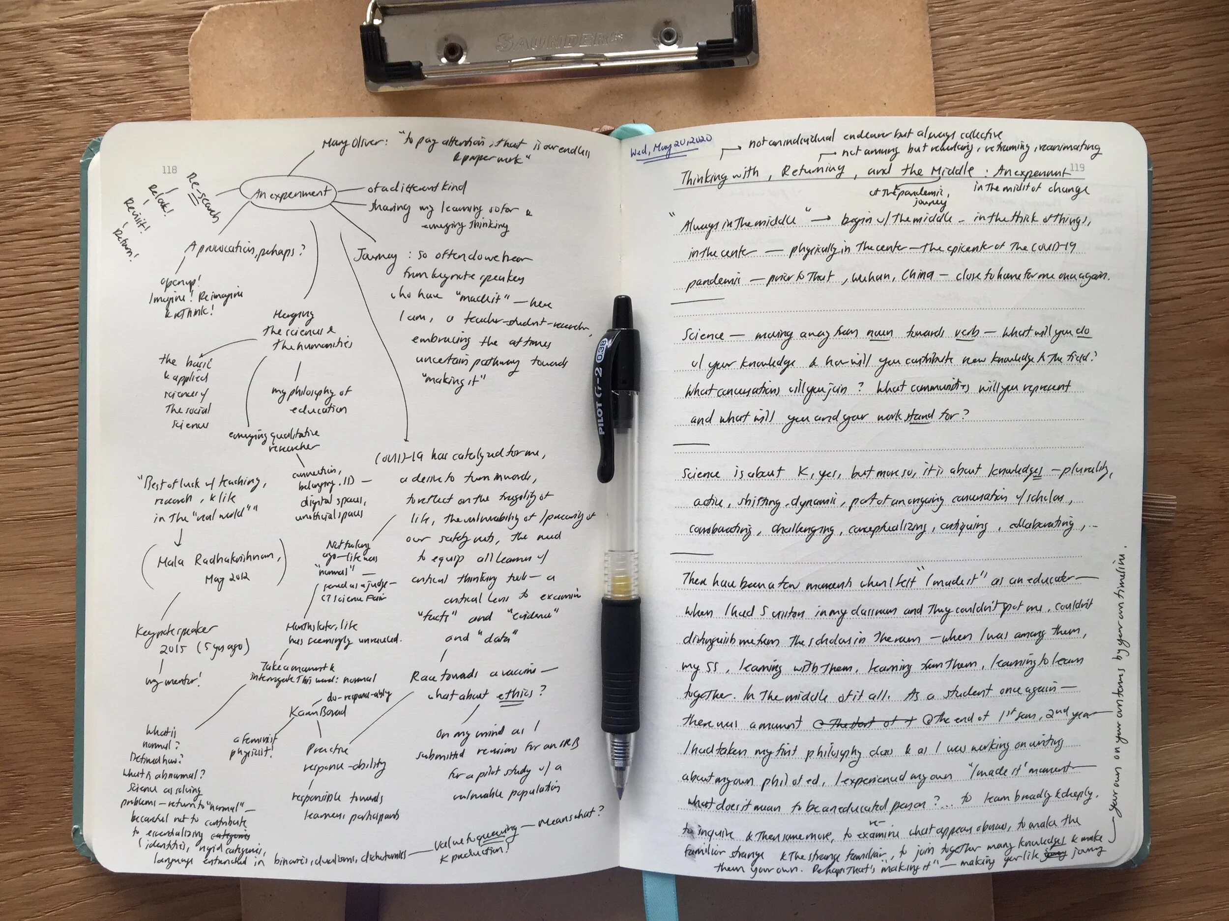 With so much swirling in my mind, I returned to my notebook with pen in hand and just scribbled whatever emerged. Among the first phrases that I wrote were “thinking with,” “returning,” and “the middle.” Thinking with. Returning. The middle.